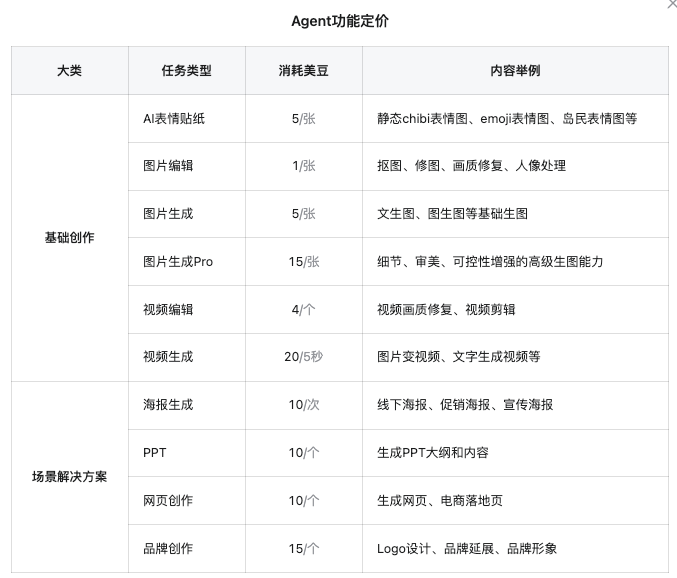 | AI Agent | 1~20个美豆不等 详细可看后方功能定价截图 | 按需 |