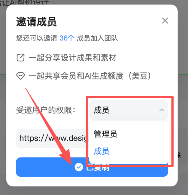 若希望伙伴加入的时候就自动设置好在团队中的角色,可在邀请弹窗中选择角色:成员 / 管理员