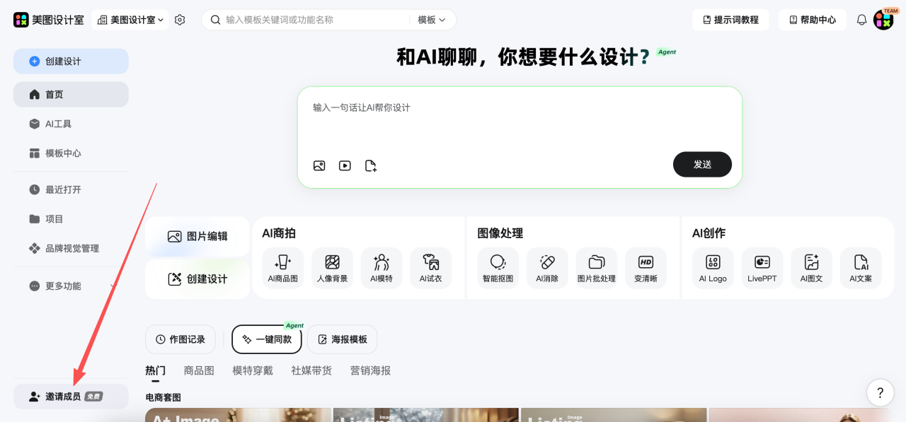 1)首页左下角,点击「邀请成员」,或在右上角点击“设置 (⚙️)”,进入团队后台-「成员管理」-「邀请成员」